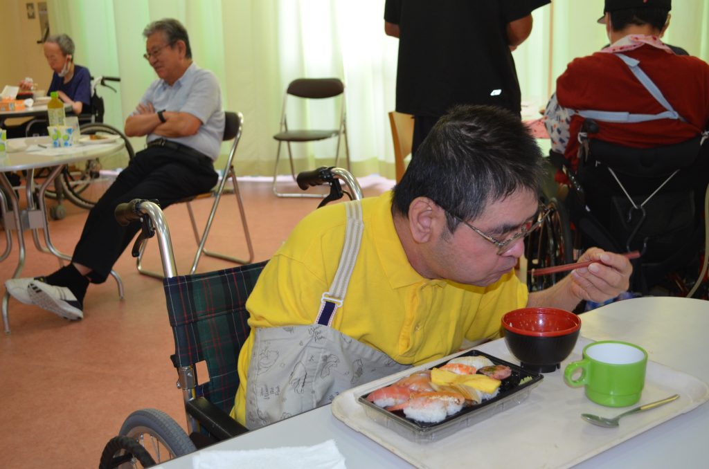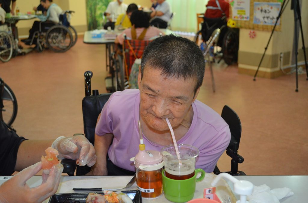 会食ではお寿司をメインとし、それ以外にお好み焼き串、チキンナゲット、フライドポテト、アイスクリーム、飲み物はビールをはじめアルコールやジュース等を用意し、お好きな商品を選んで頂きました。入所者さんからは、「どの食べ物も美味しかった。」「久しぶりのビールは最高。」とたくさんの感想を頂きました。