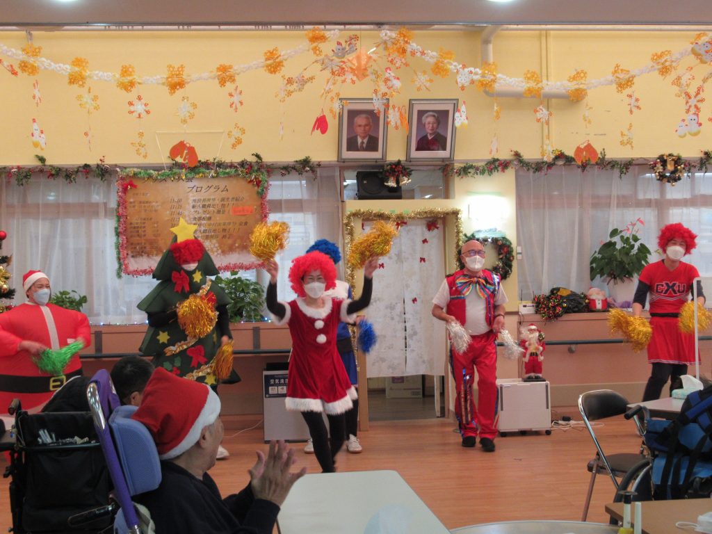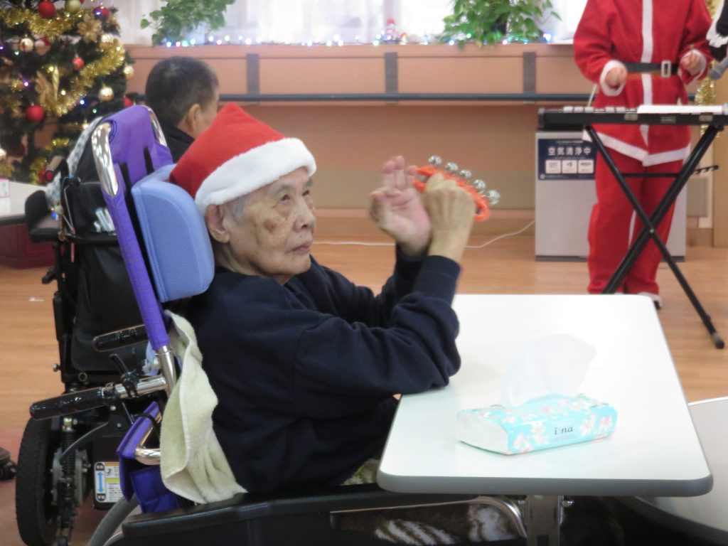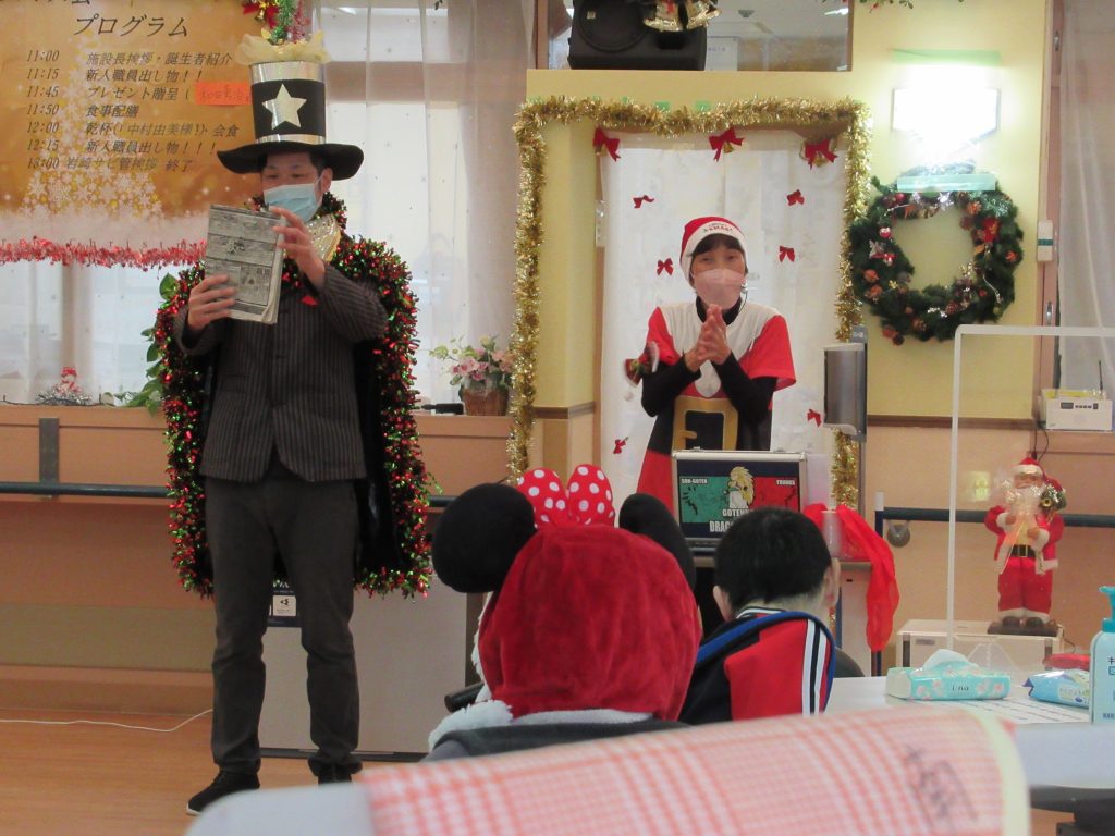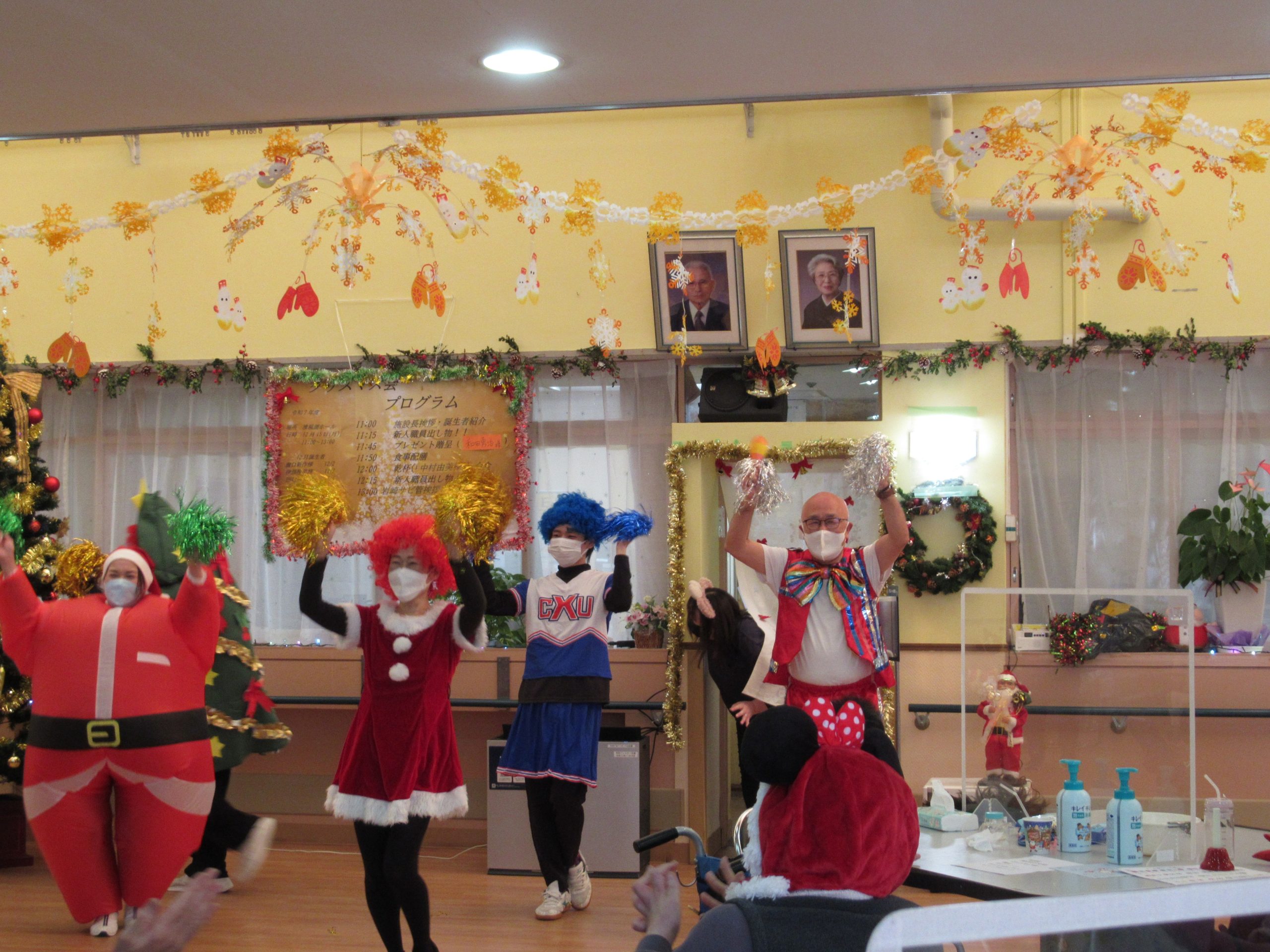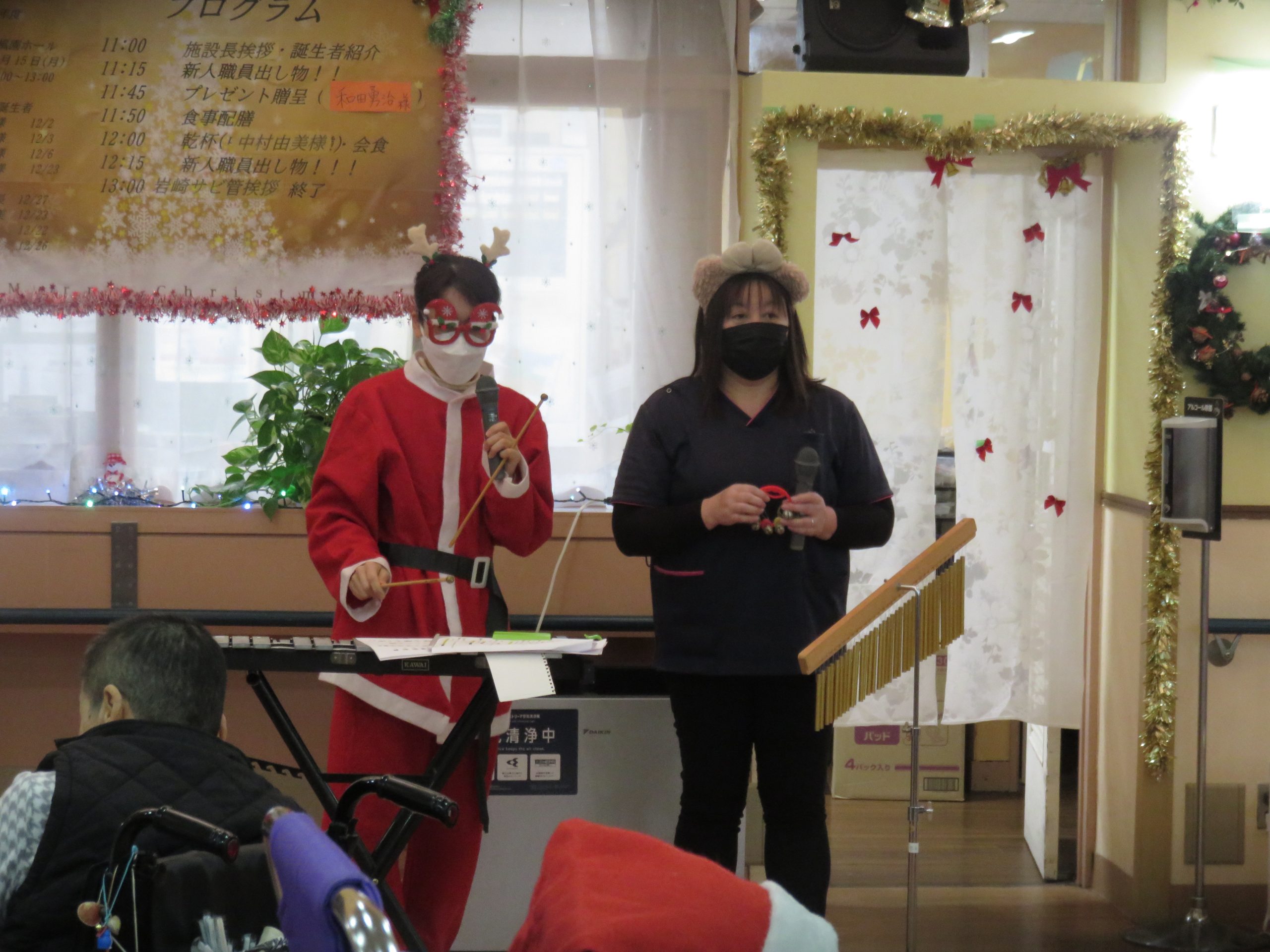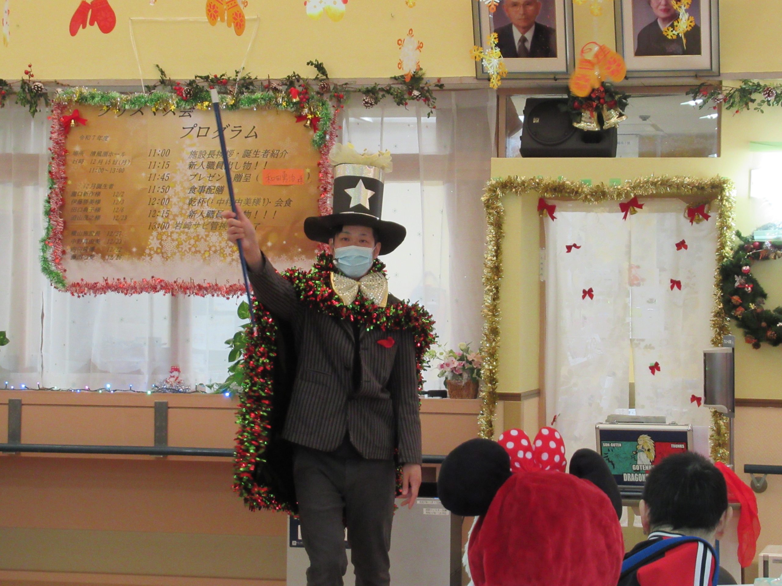 湯免清風園☆クリスマス会 Posted on 2025年12月23日 by 社会福祉法人清風会 統括本部事務局 12月15日、湯免清風園にてクリスマス会を行いました。利用者様もクリスマスコスチュームを身につけて参加しました。 施設長サンタさんよりプレゼント🎁 マジックショー!! 二人羽織で会場を笑わせてくれました♪ ダンスを披露♡ 食事はパンのバイキングをしました。チキンやケーキ、シャンメリーも準備されており、利用者様は喜んでおられました!! ハンドベルや鈴を使ってジングルベルを演奏♪ 職員の出し物や利用者様の素敵な演奏もあり、楽しいクリスマス会となりました☆